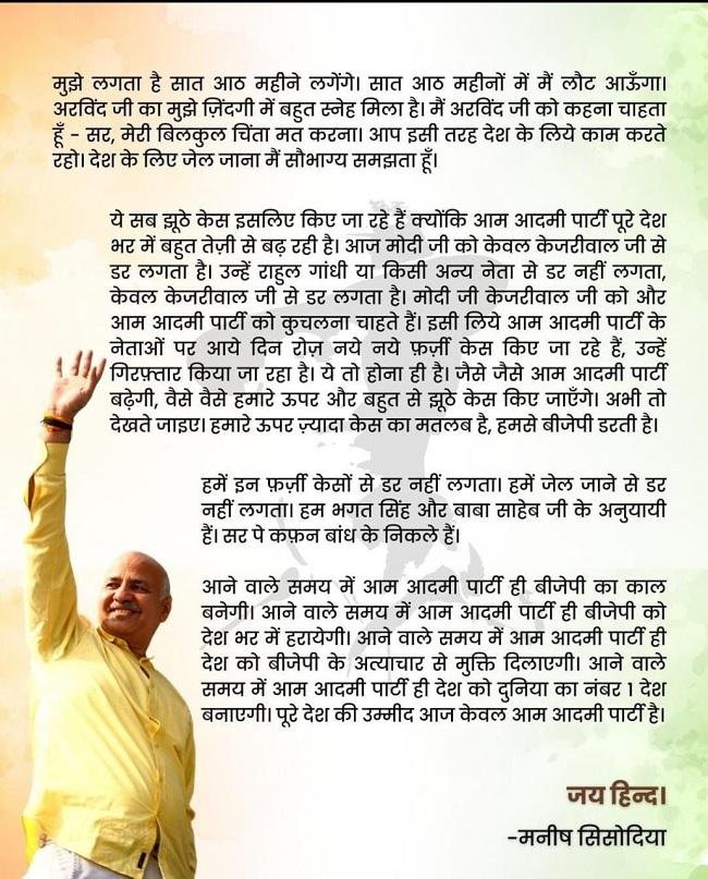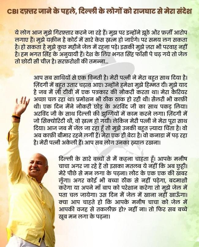 सिसोदिया ने कहा कि मैं पत्रकारिता कर रहा था. अच्छी जिंदगी चल रही थी, वो सबकुछ छोड़कर केजरीवाल के साथ आया. मैंने पूरे जीवन ईमानदारी के साथ काम किया. मुझे झूठे आरोपों में जेल भेजा जाएगा. मुझे जेल जाने से डर नहीं लगता, लेकिन मेरी वाइफ घर पर अकेली है. वो बीमार रहती है. बस उनका ख्याल रखना क्योंकि उन्होंने मेरा हमेशा साथ दिया है.