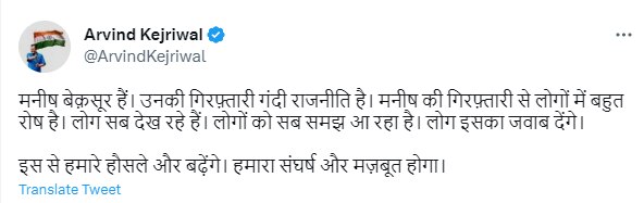 अरविंद केजरीवाल ने सिसोदिया को बेकसूर बताते हुए कहा कि इससे हमारे हौसले और बढ़ेंगे. उन्होंने ट्वीट किया, "मनीष बेक़सूर हैं. उनकी गिरफ़्तारी गंदी राजनीति है. मनीष की गिरफ़्तारी से लोगों में बहुत रोष है. लोग सब देख रहे हैं. लोगों को सब समझ आ रहा है. लोग इसका जवाब देंगे. इससे हमारे हौसले और बढ़ेंगे. हमारा संघर्ष और मज़बूत होगा."