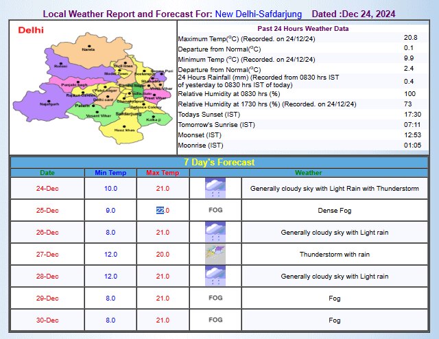 दिल्ली आज सुबह कोहरे की चादर में लिपटी रही, जिसका असर फ्लाइट्स से लेकर ट्रेनों पर भी देखने को मिल रहा है. आज, 25 दिसंबर, 2024 को सुबह 8.30 बजे सफदरजंग में न्यूनतम तापमान 8.4 डिग्री सेल्सियस दर्ज किया गया. वहीं, पालम में तापमान 9.6 डिग्री सेल्सियस रहा. मौसम विभाग के मुताबिक आज अधिकतम तापमान 22 डिग्री सेल्सियस रह सकता है. लेकिन अगले तीन दिन बारिश फिर परेशानी बढ़ा सकती है.