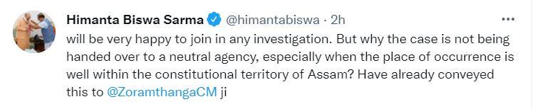 शनिवार को किए गए एक ट्वीट में सीएम हिमंता ने जिक्र किया, 'किसी भी जांच में शामिल होने में मुझे बहुत खुशी होगी. लेकिन मामला एक तटस्थ एजेंसी को क्यों नहीं सौंपा जा रहा है, खासकर तब, जब घटना की जगह असम के संवैधानिक क्षेत्र के भीतर है? हम यह पहले ही सीएम जोरमथंगा को बता चुके हैं.'