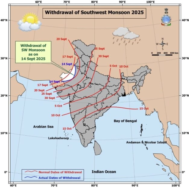 भारतीय मौसम विभाग के मुताबिक, मॉनसून आमतौर पर 1 जून तक केरल में प्रवेश करता है और 8 जुलाई तक पूरे देश को कवर कर लेता है. फिर ये 17 सितंबर के आसपास उत्तर-पश्चिम भारत से पीछे हटना शुरू कर देता है और 15 अक्टूबर तक पूरी तरह से वापस चला जाता है. आईएमडी का पूर्वानुमान था कि 15 सितंबर के आसपास पश्चिमी राजस्थान के कुछ हिस्सों से दक्षिण-पश्चिम मॉनसून की वापसी के लिए परिस्थितियां अनुकूल हैं. हालांकि ये वापसी 14 सितंबर से ही शुरू हो गई.