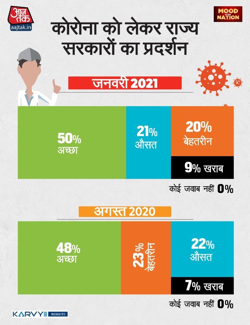 इस सर्वे के मुताबिक, कोरोना काल में केंद्र से राज्य सरकारों के काम को ज्यादा पसंद किया गया. राज्यों के काम को (आउटस्टैंडिंग-20%), अच्छा (50%), औसत (20%), खराब (7%) और बहुत खराब (2%) लोगों ने बताया. वहीं, केंद्र के काम को (आउटस्टैंडिंग-20%), अच्छा (47%), औसत (22%), खराब (8%) और बहुत खराब (2%) आंका गया.