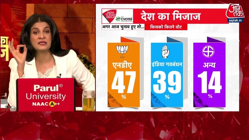 वोट प्रतिशत की बात करें तो अगर मौजूदा समय में चुनाव होते हैं तो एनडीए को 47 फीसदी का फायदा होता नजर आ रहा है. इंडिया ब्लॉक को 39 फीसदी तो अन्य को 14 फीसदी वोट मिलते नजर आ रहे हैं.