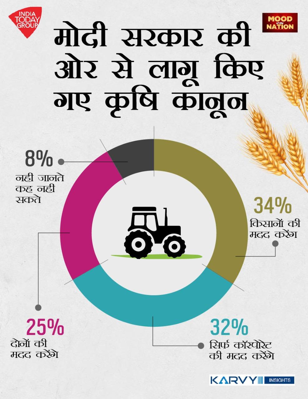 कृषि कानूनों के खिलाफ किसानों के प्रदर्शन के बीच यह सर्वे कराया गया है. सर्वे के जरिए यह भी जानने की कोशिश की गई कि मोदी सरकार की ओर से लागू किए गए कृषि कानून के बारे में क्या राय है. 34 फीसदी लोग मानते हैं कि ये कानून किसानों की मदद करेंगे तो 32 फीसदी लोगों का मानना है कि सिर्फ कॉरपोरेट की मदद करेंगे. 25 फीसदी लोगों की राय है कि ये कानून दोनों पक्षों की मदद करेंगे.
