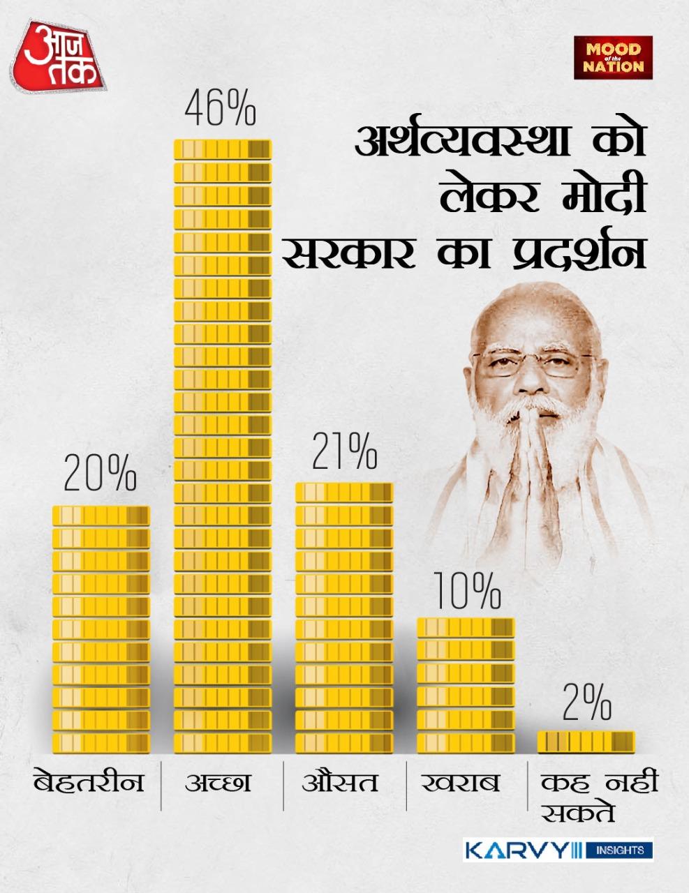 देश का मिजाज सर्वे में अर्थव्यवस्था को लेकर मोदी सरकार के प्रदर्शन पर राय जानने की कोशिश की गई. सर्वे में 46 फीसदी लोग इसे अच्छा मानते हैं तो 20 फीसदी लोग बेहतरीन करार देते हैं. हालांकि 21 फीसदी लोगों की राय है कि यह औसत रहा है. 10 फीसदी लोग इसे खराब करार देते हैं.