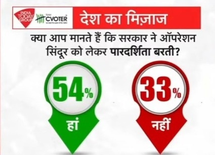 मूड ऑफ द नेशन सर्वे में लोगों से पूछा गया कि क्या आप मानते हैं कि सरकार ने ऑपरेशन सिंदूर को लेकर पारदर्शिता बरती? इस सवाल पर 54 फीसदी लोग सहमत हुए, उन्होंने कहा कि हां, सरकार ने पारदर्शिता बरती. वहीं 33 फीसदी लोगों ने कहा कि ऑपरेशन सिंदूर में पारदर्शिता नहीं बरती गई.