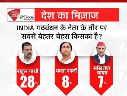 सर्व में लोगों से पूछा गया कि INDIA गठबंधन के नेता के तौर पर सबसे बेहतर चेहरा किसका है? इसके जवाब में 28 फीसदी ने राहुल गांधी को तो 8 फीसदी ने ममता बनर्जी और 7 फीसदी ने अखिलेश यादव को बेहतर चेहरा माना.