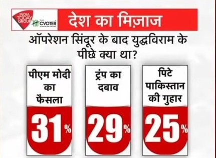 जब लोगों से ऑपरेशन सिंदूर के दौरान हुए सीजफायर के बारे में पूछा गया तो 30.7% लोगों ने इसे पीएम मोदी का फैसला बताया जबकि 29.1% का मानना है कि यह ट्रंप का दबाव था जबकि 24.9% लोगों ने कहा कि ऑपरेशन सिंदूर से पाकिस्तान बुरी तरह पिट गया था जिसके बाद उसकी गुहार पर सीजफायर हुआ. वहीं 15.3% लोगों का जवाब कह नहीं सकते में रहा.