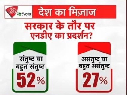 इस सर्वे में लोगों से पूछा गया कि क्या वह सरकार के तौर पर एनडीए के प्रदर्शन को कैसे आंकते हैं? इस पर 52 फीसदी लोग संतुष्ट या बहुत संतुष्ट नजर आए जबकि 27 फीसदी असंतुष्ट या बहुत असंतुष्ट नजर आए.