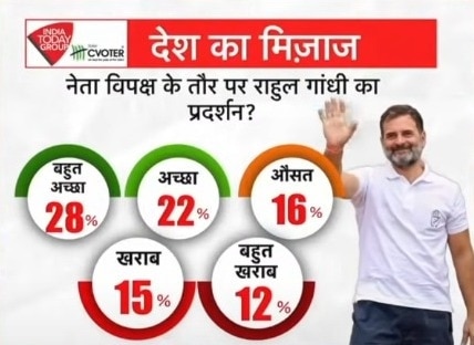 लोगों से पूछा गया कि नेता विपक्ष के तौर पर राहुल गांधी के प्रदर्शन को वह किस तरह देखते हैं, इसके जवाब में 28 फीसदी लोगों ने कहा कि यह प्रदर्शन बहुत अच्छा है जबकि 22 प्रतिशत लोगों ने इसे अच्छा, 16 प्रतिशत ने औसत और 15 प्रतिशत ने खराब तथा 12 प्रतिशत ने बहुत खराब बताया.