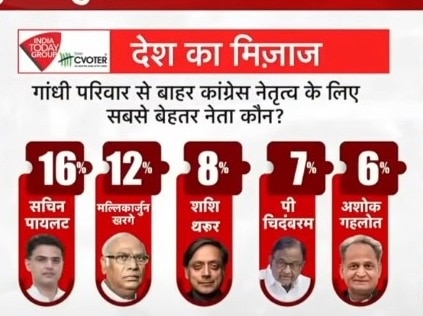 लोगों से पूछा गया कि गांधी परिवार से बाहर कांग्रेस नेतृत्व के लिए सबसे बेहतर नेता कौन है? इस पर 16 % ने सचिन पायलट को, 12 % ने मल्लिकार्जुन खड़गे को, 8 % ने शशि थरूर, 7 % ने पी चिदंबरम और 6% अशोक गहलोत को बेहतर नेता बताया.