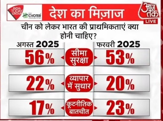 चीन को लेकर भारत की प्राथमिकताएं क्या होनी चाहिए, इस सवाल के जवाब में 56 फीसदी लोगों ने सीमा सुरक्षा का नाम लिया. 22 फीसदी लोगों ने व्यापार में सुधार और 17 फीसदी लोग कूटनीतिक बातचीत को प्राथमिकता बताया है. गौरतलब है कि मूड ऑफ नेशन फरवरी 2025 के सर्वे में 53 फीसदी लोगों ने सीमा सुरक्षा, 20 फीसदी लोगों ने व्यापार में सुधार और 23 फीसदी लोगों ने कूटनीतिक बातचीत को प्राथमिकता बताया था.