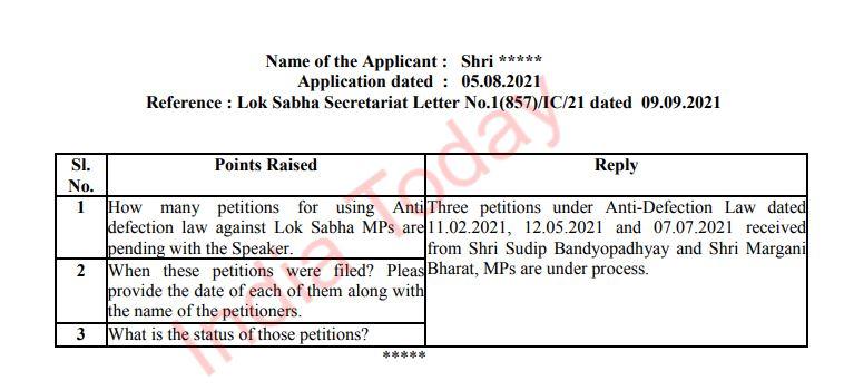 लोकसभा सचिवालय ने अपने जवाब में कहा है कि दल-बदल विरोधी कानून (Anti-Defection Law) के तहत 11 फरवरी 2021, 12 मई 2021 और 7 जुलाई 2021 को तीन याचिकाएं लोकसभा को प्राप्त हुई है. ये याचिका सांसद सुदीप बंदोपाध्याय और सांसद मरगनी भारत से मिली हैं. लोकसभा सचिवालय ने कहा है कि इन याचिकाओं पर विचार किया जा रहा है.