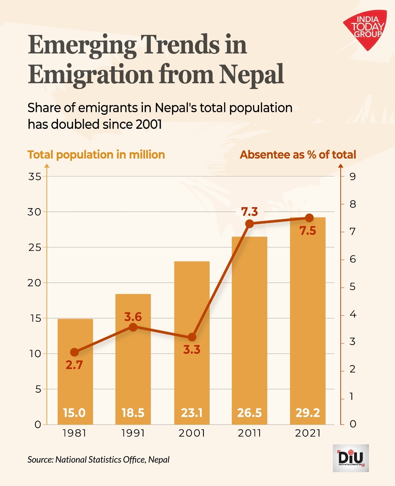नेपाल की 2021 की जनगणना बताती है कि देश की कुल आबादी का 7.5% हिस्सा प्रवासी है. 1981 में ये आंकड़ा सिर्फ 2.7% था और 2001 में 3.3%. भारत और खाड़ी देश अब भी सबसे पसंदीदा ठिकाने हैं.