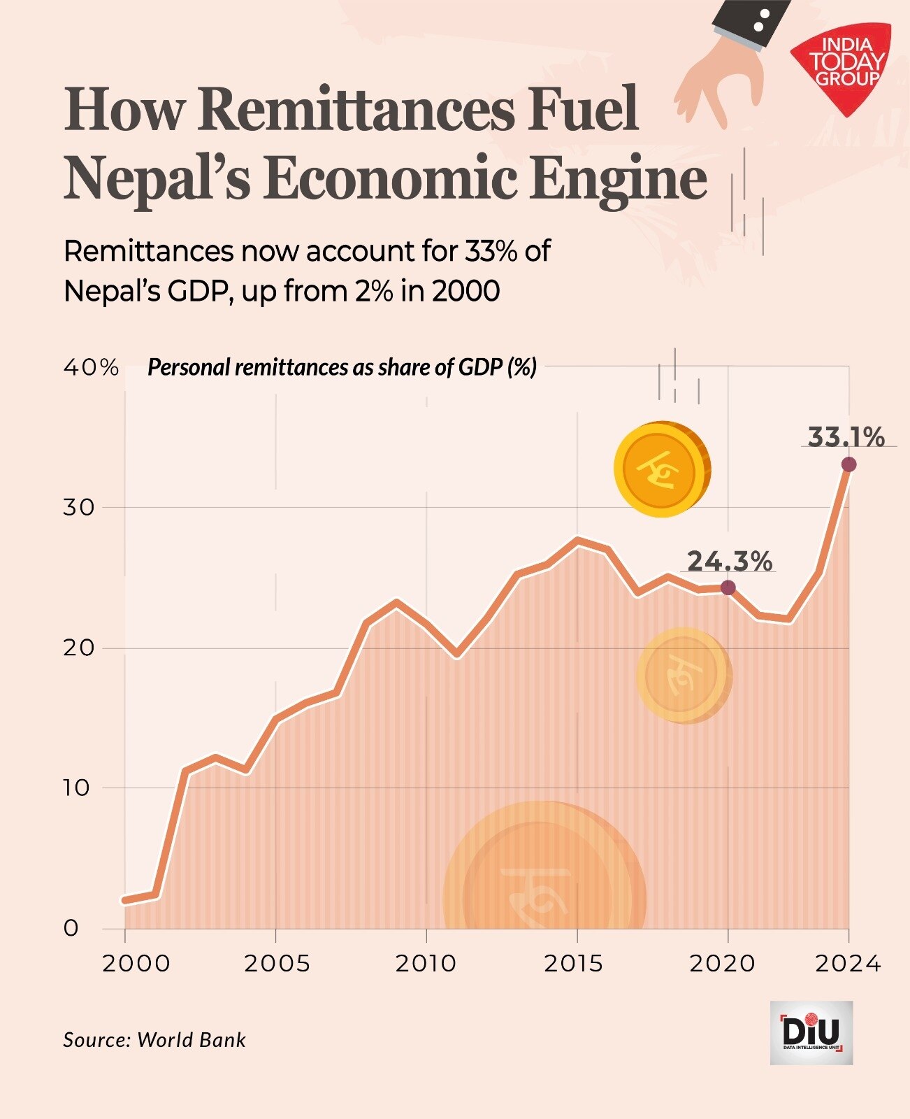 प्रवासियों की वजह से नेपाल में रेमिटेंस काउंटर्स सालभर व्यस्त रहते हैं. वर्ल्ड बैंक के अनुसार, 2024 में नेपाल की जीडीपी का 33% से ज्यादा हिस्सा सिर्फ रेमिटेंस से आया. 2000 में यह हिस्सा सिर्फ 2% था.