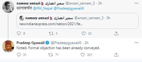 इसका जवाब देते हुए विदेश मंत्री प्रदीप ग्यावली ने जवाब दिया और कहा कि इस मुद्दे को नोट कर लिया गया है और भारत सरकार के साथ औपचारिक विरोध दर्ज करा दिया गया है. उन्होंने कहा, "नोट कर लिया गया है और औपचारिक आपत्ति दर्ज करा दी गई है."