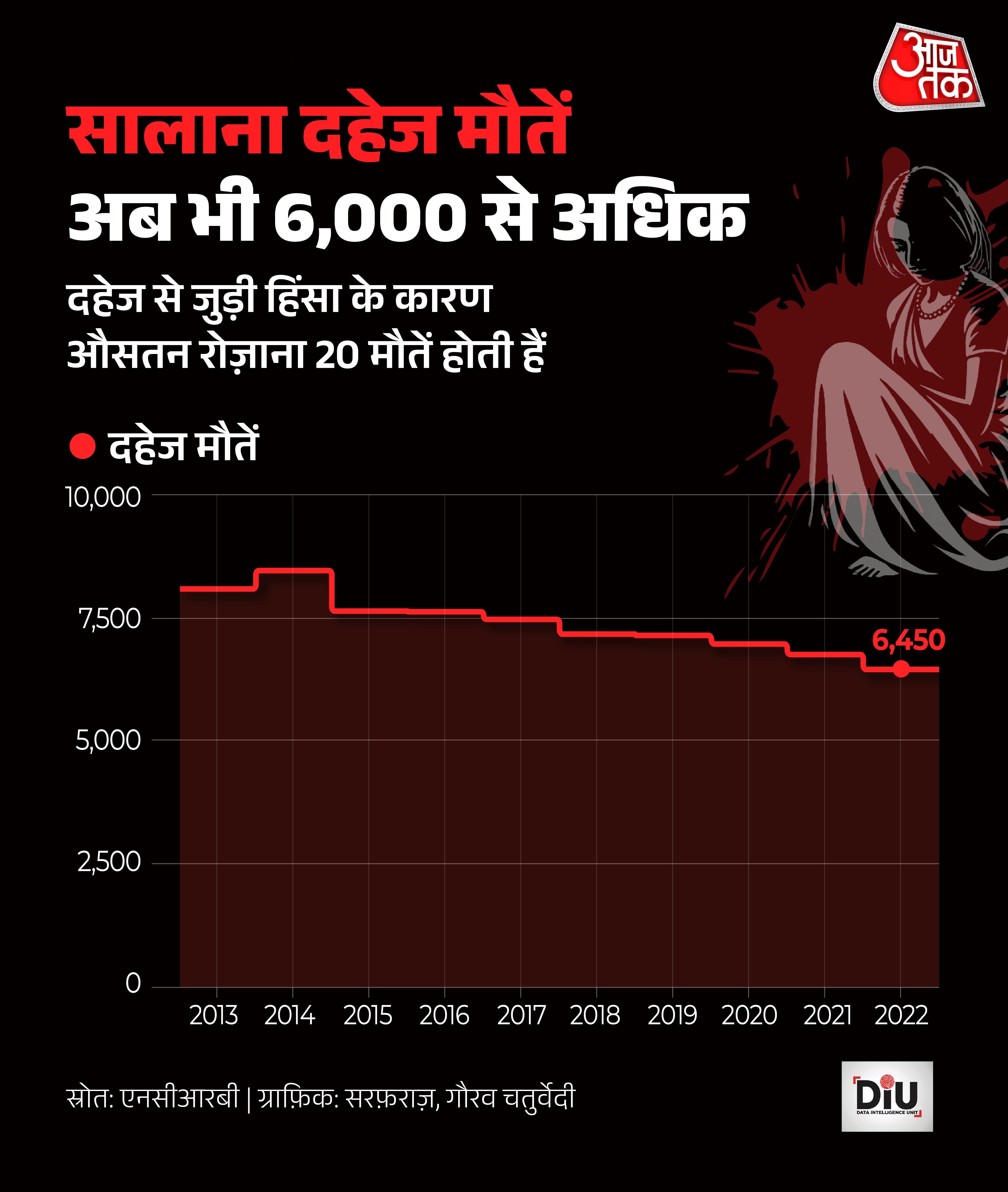 नेशनल क्राइम रिकॉर्ड्स ब्यूरो (NCRB) के मुताबिक, साल 2022 में भारत में 6,450 दहेज हत्याएं दर्ज हुईं. यानी औसतन हर दिन 18 औरतें दहेज की वजह से जान गंवा देती हैं. साल 2018 से 2022 के बीच कुल 34,477 औरतों की जान इस हिंसा ने ले ली.