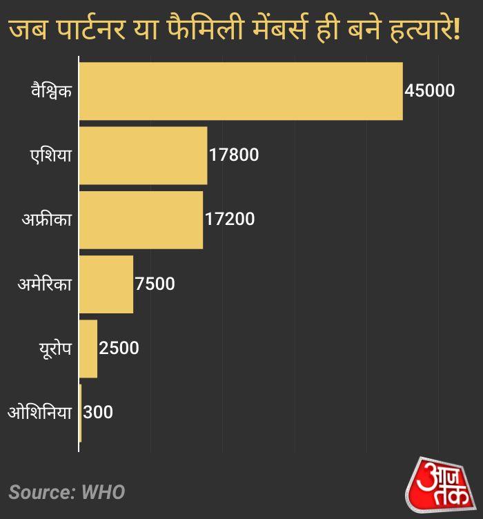 इन 87 हजार में से 45 हजार महिलाओं की हत्या उनके इंटीमेट पार्टनर या फैमिली मेंबर्स ने ही की थी. सबसे ज्यादा 17 हजार 800 महिलाओं की हत्या एशिया में हुई थी. वहीं, 17 हजार 200 महिलाओं की हत्या अफ्रीका में हुई थी.