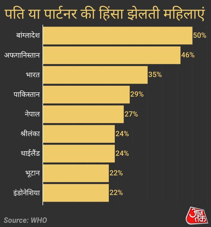 आंकड़ों के हवाले से देखा जाए कि इस मामले में भारतीय महिलाओं की हालत पाकिस्तानी महिलाओं से भी खराब है. इसी उम्र की 29 फीसदी पाकिस्तानी महिलाओं ने पति या पार्टनर की हिंसा को झेला है, जबकि, बांग्लादेश की 50 फीसदी महिलाएं हिंसा से जूझ चुकी या रही हैं.