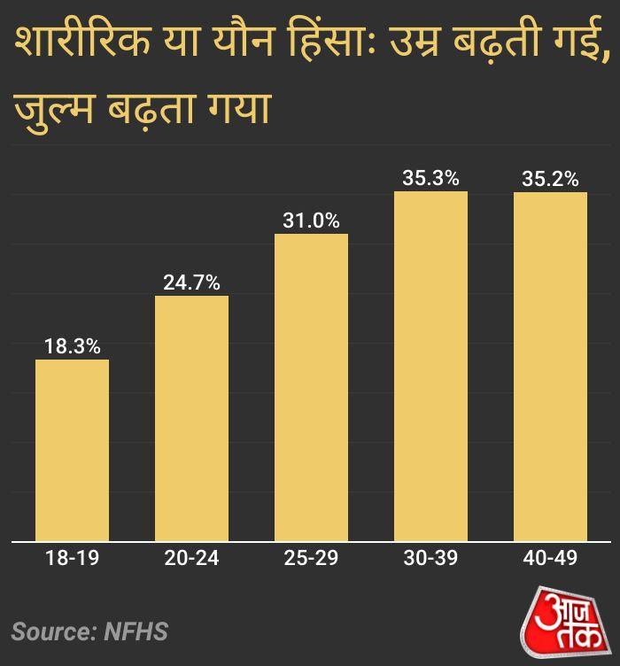 मसलन, 18 से 19 साल की लगभग 18 फीसदी महिलाओं ने अपने साथ शारीरिक या यौन हिंसा होने की बात बताई थी. जबकि, 40 से 49 साल की 35 फीसदी महिलाएं शारीरिक या यौन हिंसा का शिकार होती हैं.