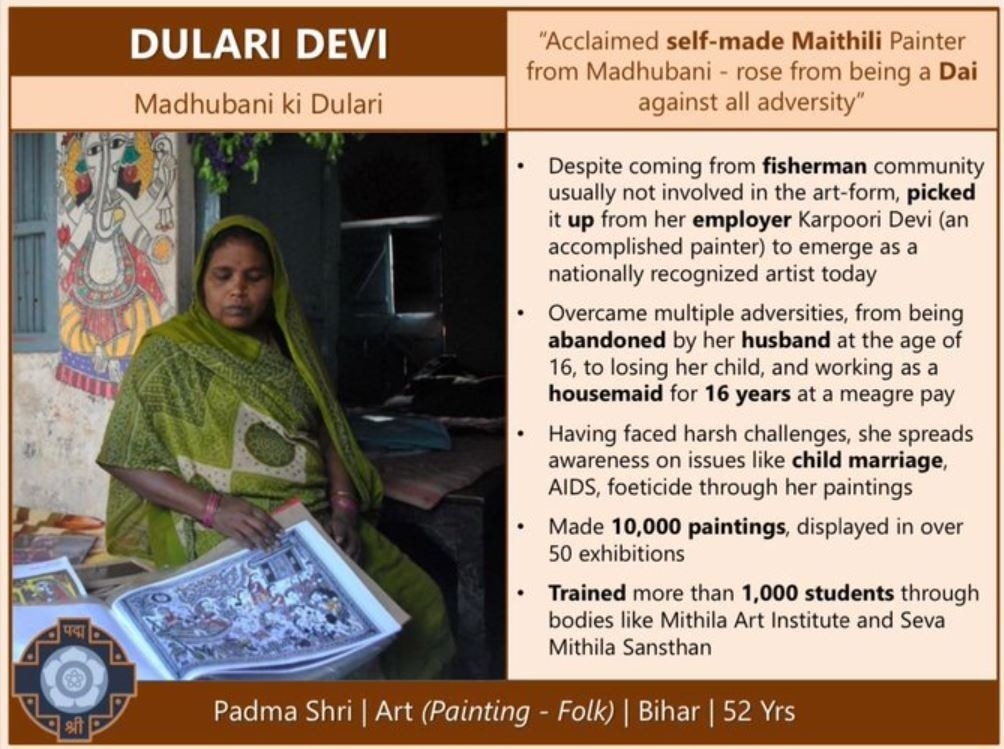 दुलारी देवी मिथिला आर्ट्स के लिए जानी जाती हैं. वर्ष 2021 में उन्हें कला में उनके योगदान के लिए भारत सरकार द्वारा पद्म श्री से सम्मानित किया गया था.