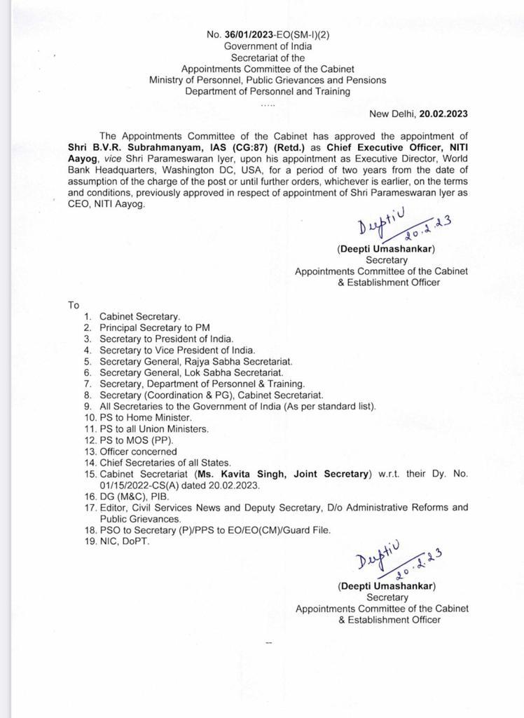 केंद्र सरकार ने नीति आयोग के मुख्य कार्यकारी अधिकारी (CEO) के तौर पर बीवीआर सुब्रमण्यम की नियुक्ति को मंजूरी दी. कैबिनेट की नियुक्ति समिति ने सोमवार को यह फैसला किया है.