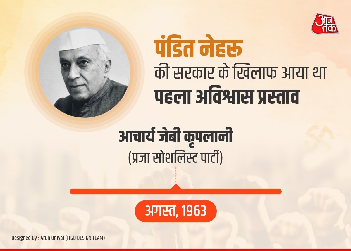 आजादी के बाद 1963 में पहली बार किसी सरकार का सामना संसद में अविश्वास प्रस्ताव से हुआ. 1962 के चीन युद्ध में हार के बाद आचार्य जेबी कृपलानी ने अगस्त 1963 में संसद के मॉनसून सत्र के दौरान पंडित जवाहरलाल नेहरू के नेतृत्व वाली सरकार के खिलाफ अविश्वास प्रस्ताव पेश किया था.