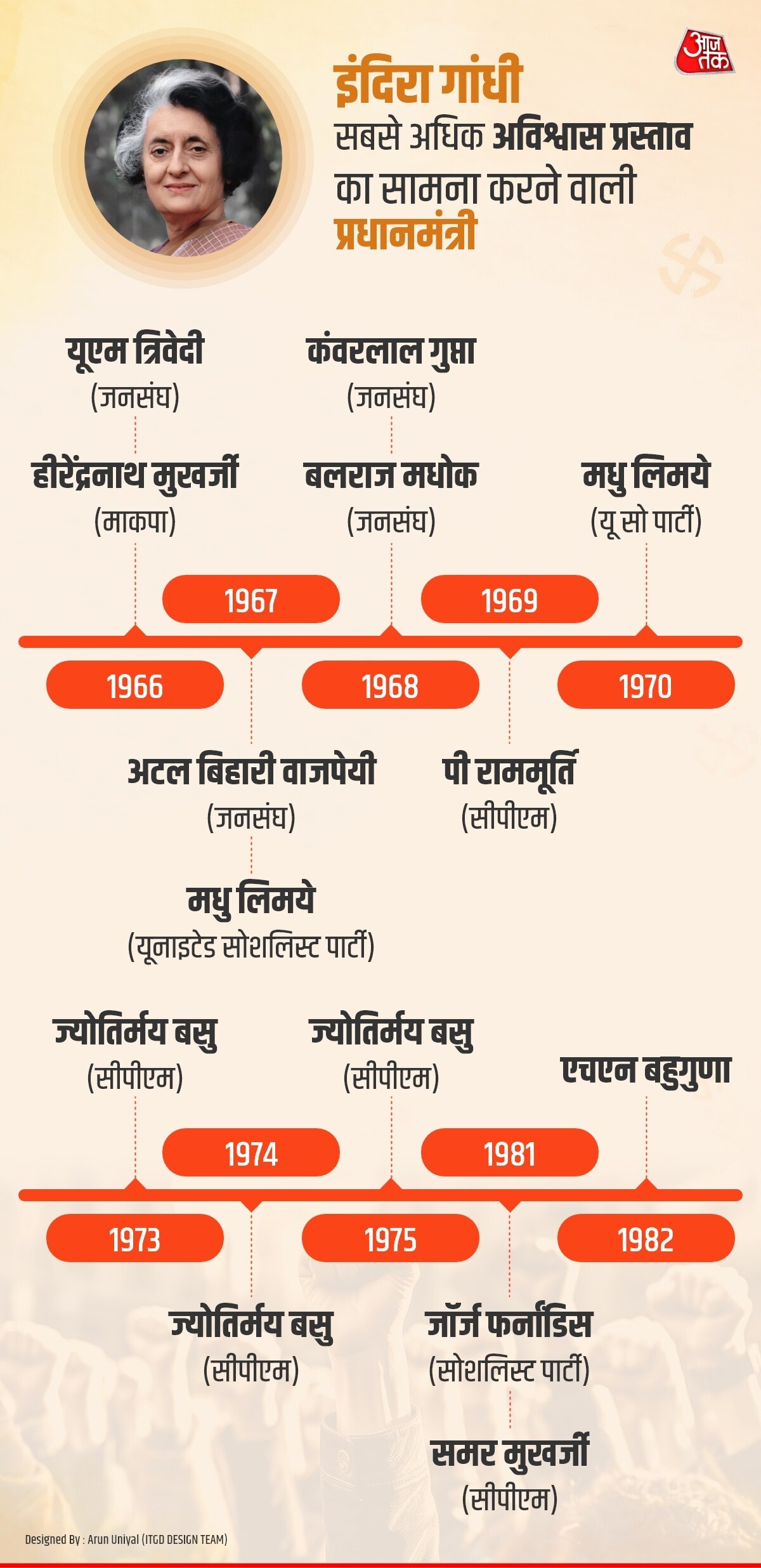 साल 1963 में पहला अविश्वास प्रस्ताव पेश किया गया था और साल 1970 आते-आते इसकी संख्या 12 तक पहुंच गई थी. 1963 से 1982 तक, 19 साल में 21 अविश्वास प्रस्ताव पेश किए जा चुके थे. प्रधानमंत्री रहते हुए इंदिरा गांधी को सबसे अधिक 15 बार अविश्वास प्रस्ताव का सामना करना पड़ा.