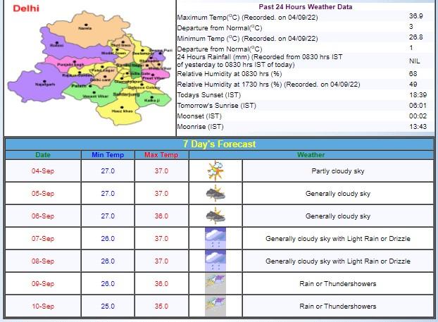 मौसम विभाग (IMD) के अनुसार, राष्ट्रीय राजधानी दिल्ली में आज, 5 सितंबर को न्यूनतम तापमान 27 डिग्री सेल्सियस जबकि अधिकतम तापमान 37 डिग्री सेल्सियस रह सकता है. दिल्ली के आसमान में आंशिक तौर पर बादल छाए रह सकते हैं, जबकि बारिश का अनुमान नहीं है. वहीं, लखनऊ का न्यूनतम तापमान 26 डिग्री और अधिकतम तापमान 36 डिग्री सेल्सियस रहेगा.