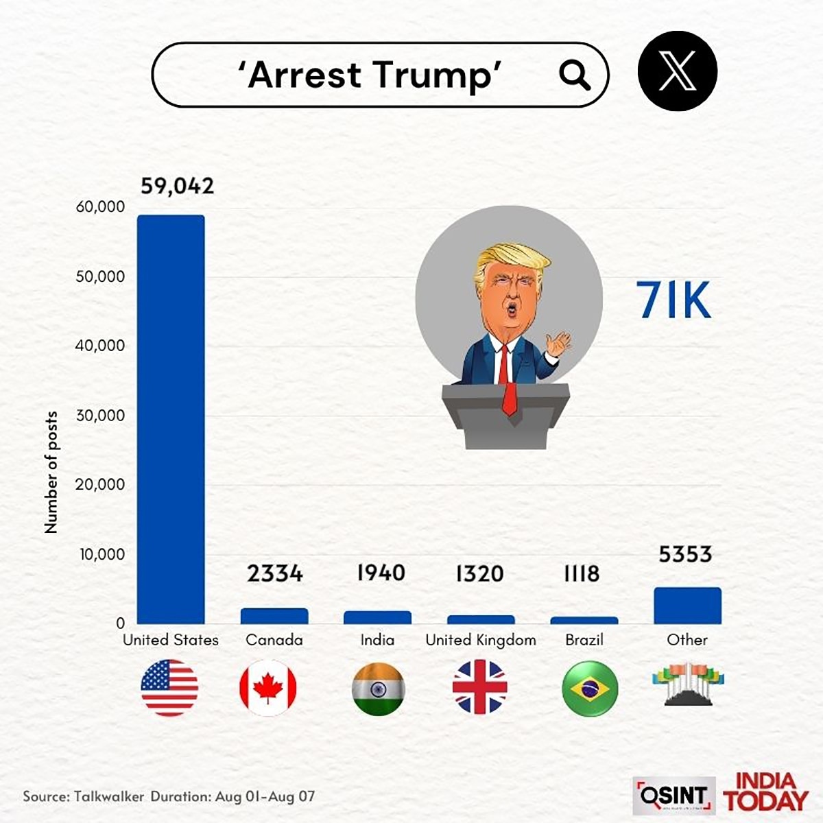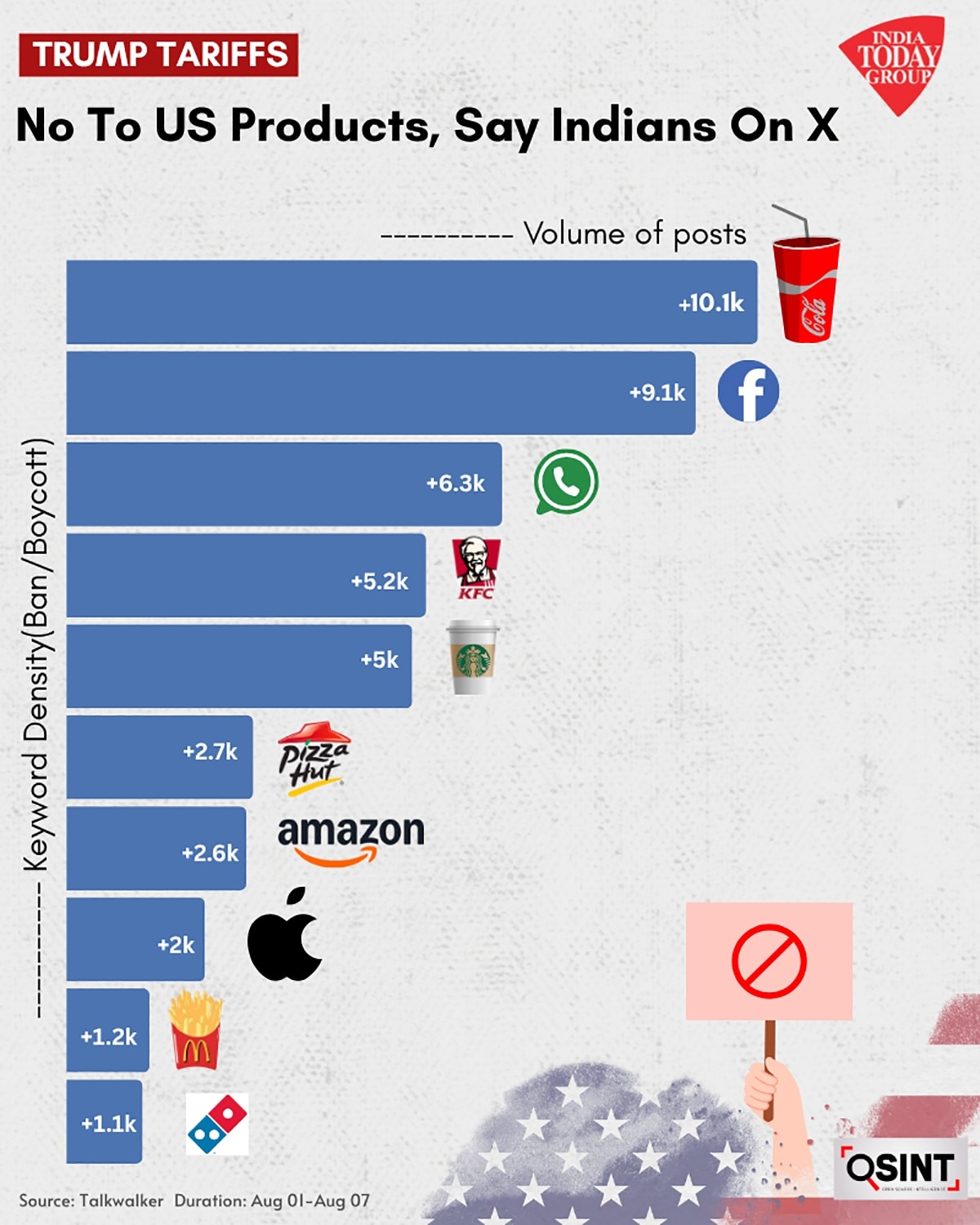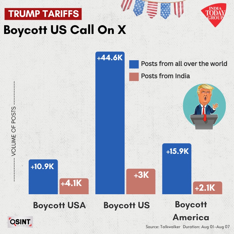 1 अगस्त से 7 अगस्त (दोपहर 3 बजे तक) के बीच 10,000 से ज्यादा पोस्ट्स में “Boycott USA”, “Boycott US” और “Boycott America” जैसे कीवर्ड्स का इस्तेमाल हुआ.