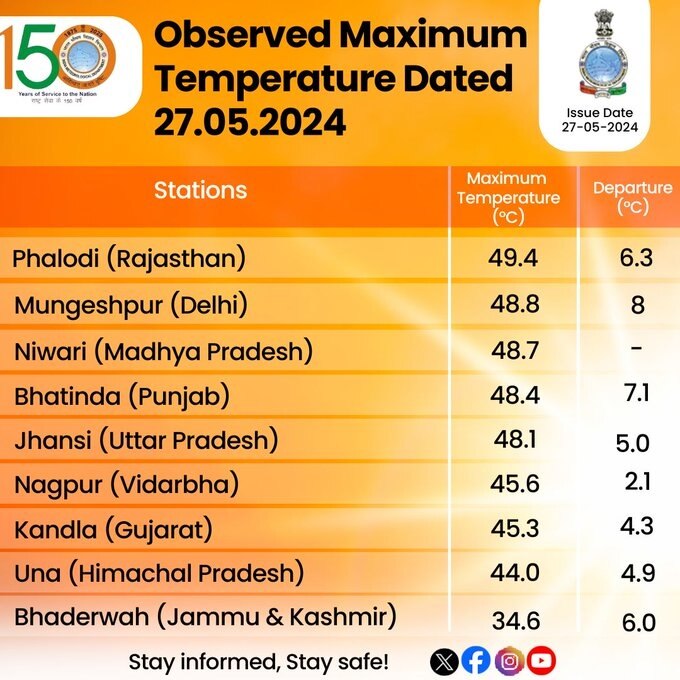 कल राजस्थान के फलोदी में 49.4 डिग्री तापमान दर्ज हुआ, इसके बाद दिल्ली के मुंगेशपुर में 48.8 तापमान रहा. मध्य प्रदेश के निवाड़ी, पंजाब के बठिंडा और यूपी के झांसी में भी कुछ यही हालात देखे गए.