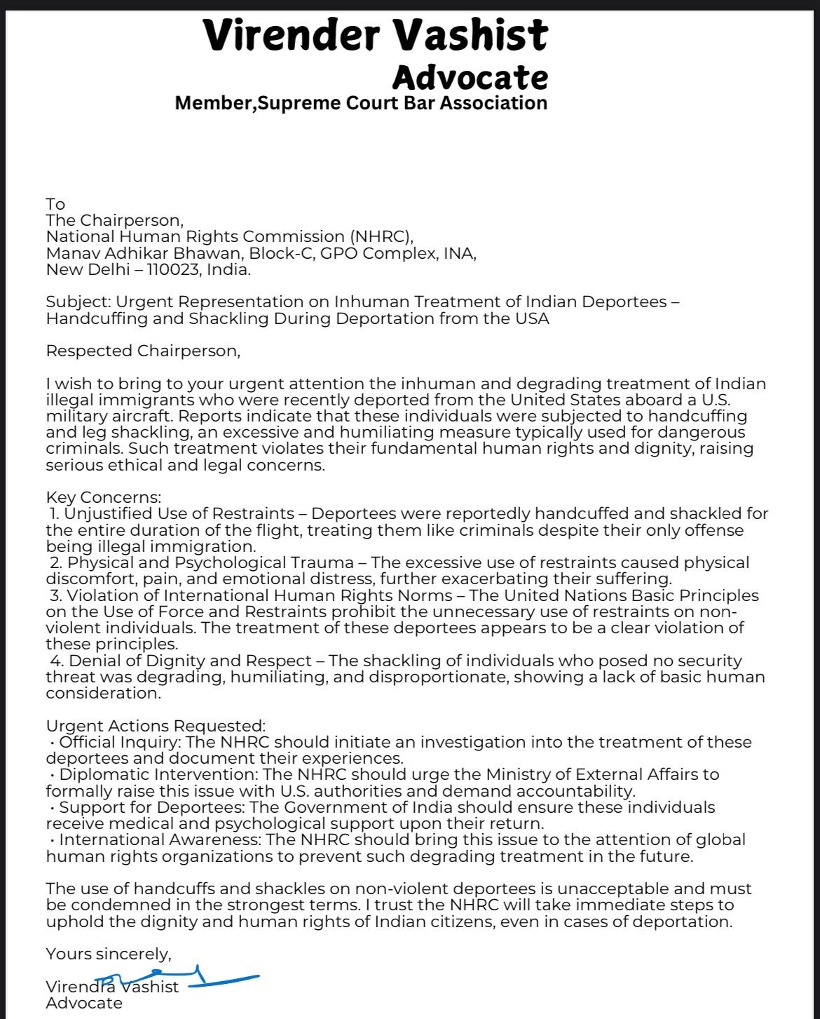 वीरेंद्र वशिष्ठ ने NHRC से तत्काल हस्तक्षेप करने और भारतीय नागरिकों के सम्मान की रक्षा करने की अपील की है. उन्होंने कहा कि गैर-हिंसक निर्वासित लोगों को हथकड़ी और बेड़ियों में जकड़कर रखना अस्वीकार्य है और इसकी कड़ी निंदा होनी चाहिए.
