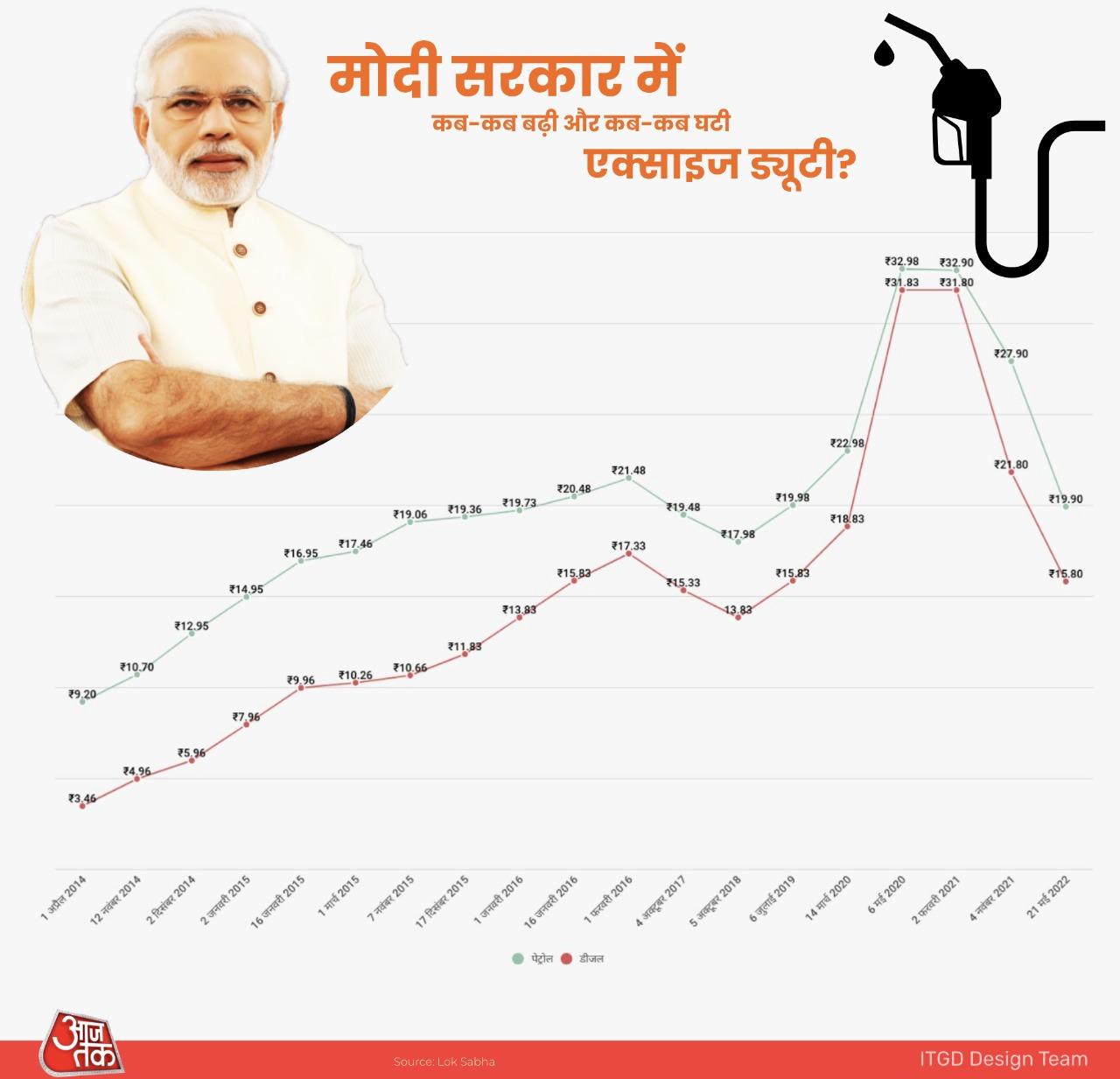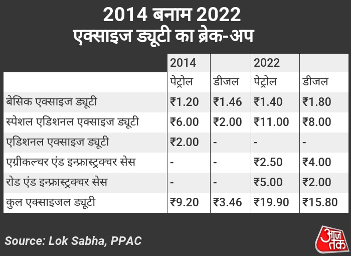 मई 2014 में जब मोदी सरकार आई थी, तब एक लीटर पेट्रोल पर 9.20 रुपये और डीजल पर 3.46 रुपये एक्साइज ड्यूटी लगती थी. मोदी सरकार आने के बाद से अब तक कई बार एक्साइज ड्यूटी बढ़ चुकी है, जबकि घटी कम ही है.