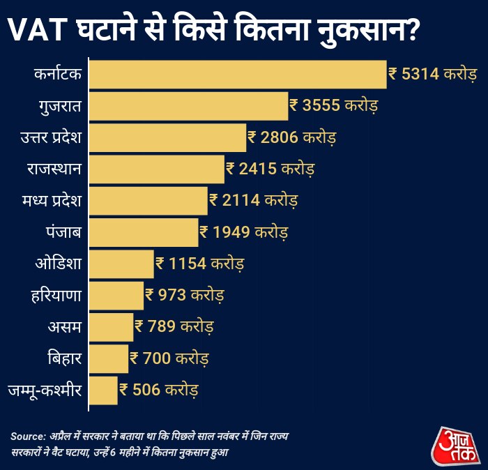 - इनके अलावा पेट्रोल-डीजल पर वैट घटाने से गुजरात को 3,555 करोड़ रुपये, हरियाणा को 973 करोड़ रुपये, असम को 789 करोड़ रुपये, जम्मू-कश्मीर को 506 करोड़ रुपये, मध्य प्रदेश को 2,114 करोड़ रुपये और पंजाब को 1,949 करोड़ रुपये का नुकसान उठाना पड़ा था.