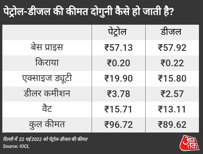- राजधानी दिल्ली में अभी एक लीटर पेट्रोल का बेस प्राइस 57.13 रुपये है. इस पर 19.90 रुपये एक्साइज ड्यूटी, 15.71 रुपये वैट और 3.78 रुपये डीलर कमीशन लगता है. इससे पेट्रोल की कीमत 96.72 रुपये हो गई.