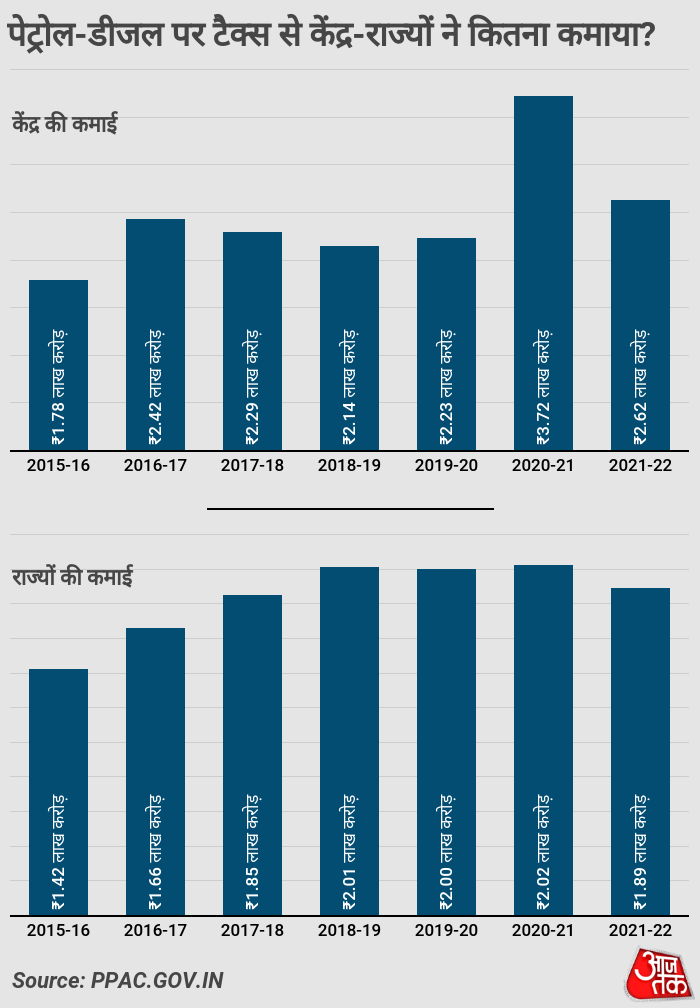 - केंद्र हो या राज्य, सरकारों की कमाई में पेट्रोल-डीजल पर लगने वाले टैक्स का बहुत बड़ा हिस्सा होता है. पेट्रोलियम प्लानिंग एंड एनालिसिस सेल के मुताबिक, अप्रैल से दिसंबर 2021 के नौ महीनों में केंद्र सरकार ने एक्साइज ड्यूटी से 2.62 लाख करोड़ रुपये और राज्य सरकारों ने वैट से 1.89 लाख करोड़ रुपये की कमाई की है.