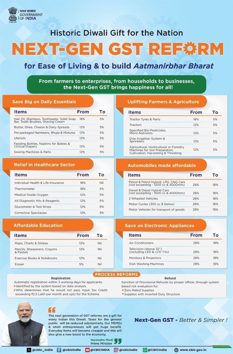 सरकार की तरफ से जीएसटी स्लैब को लेकर एक पोस्टर भी जारी किया गया है. इसमें बताया गया है कि किस चीज पर कितना जीएसटी लगेगा. इसी पोस्टर पर पीएम मोदी का देश के लोगों को संदेश भी है. इसमें पीएम मोदी ने कहा है, "जीएसटी सुधारों की अगली पीढ़ी इस दिवाली हर भारतीय के लिए एक तोहफा है. आम जनता के लिए टैक्स में काफी कमी आएगी. हमारे एमएसएमई और छोटे उद्यमियों को बड़ा लाभ होगा. रोज़मर्रा की चीजें सस्ती होंगी और अर्थव्यवस्था को एक नई ताकत मिलेगी."