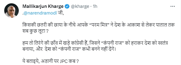 मल्लिकार्जुन खड़गे ने ट्वीट करते हुए लिखा, "नरेंद्र मोदी जी, किसकी छतरी की छाया के नीचे आपके 'परम मित्र' ने देश के आकाश से लेकर पाताल तक सब कुछ लूटा? हम तो तिरंगे की छांव में खड़े कांग्रेसी हैं, जिसने 'कंपनी राज' को हराकर देश को स्वतंत्र बनाया, और देश को “कंपनी राज” कभी बनने नहीं देंगे. ये बताइये, अडानी पर JPC कब ?"