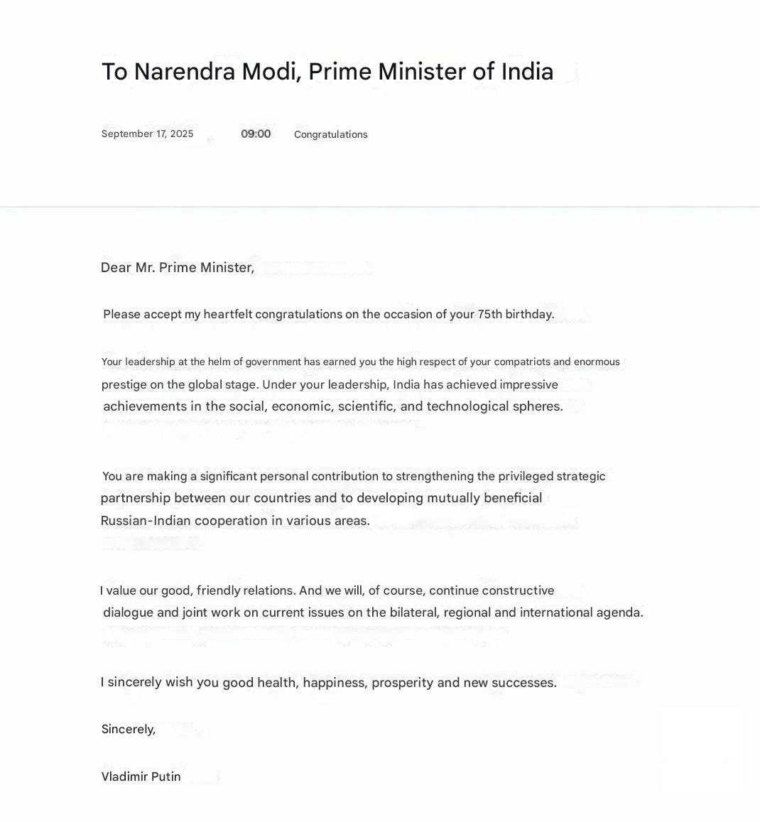 पुतिन ने कहा, 'प्यारे प्रधानमंत्री नरेंद्र मोदी जी अपने 75वें जन्मदिन पर मेरी हार्दिक बधाई एवं शुभकामनाएं स्वीकार करें. आप हमारे देशों के बीच विशेष विशेषाधिकार प्राप्त रणनीतिक साझेदारी को मजबूत करने और विभिन्न क्षेत्रों में पारस्परिक लाभकारी रूस-भारत सहयोग को विकसित करने में महान व्यक्तिगत योगदान दे रहे हैं.'