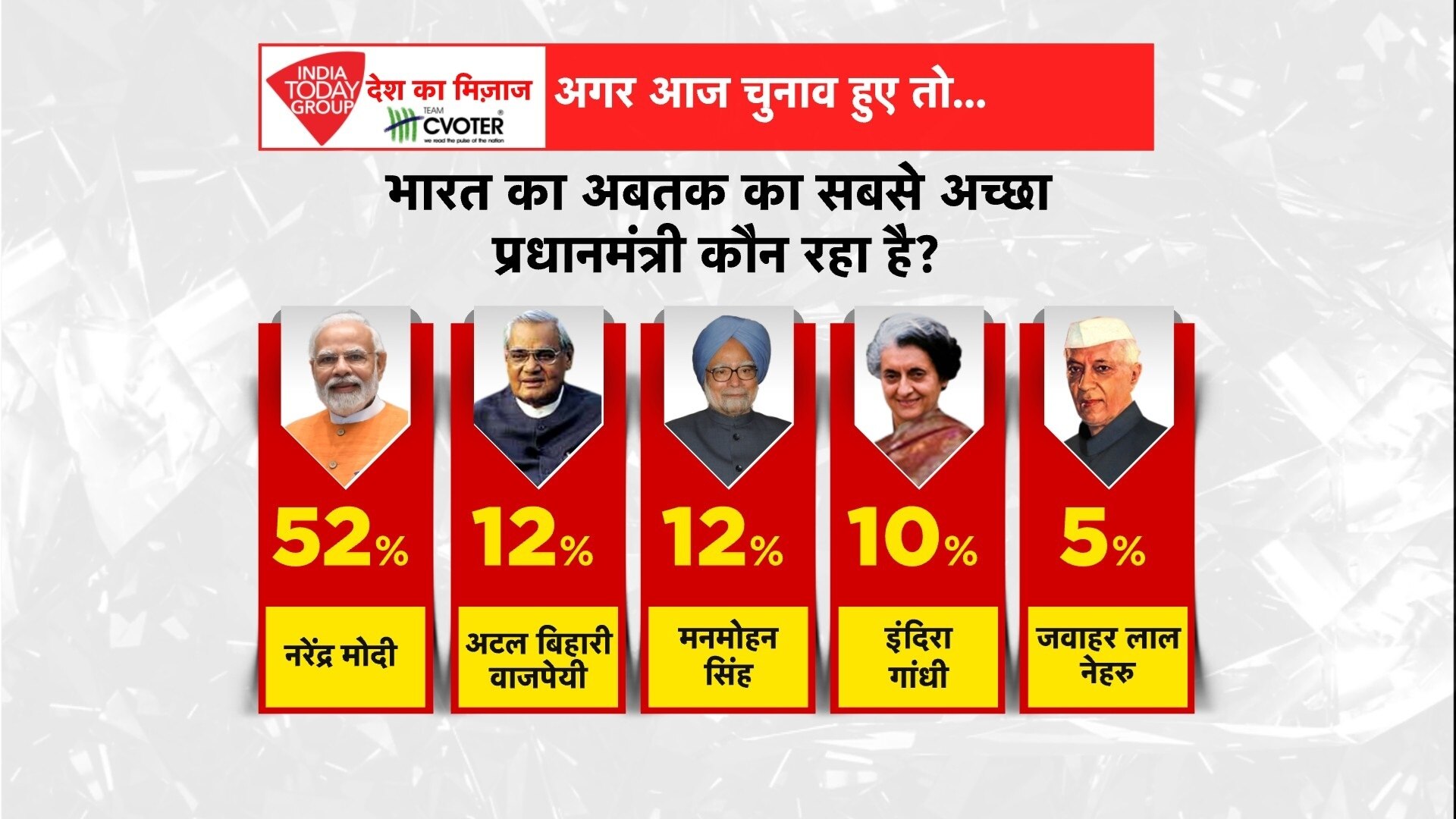 इसी सर्वे में जब ये पूछा गया कि देश का अब तक का सबसे अच्छा प्रधानमंत्री कौन रहा है, तो 52 फीसदी लोगों ने नरेंद्र मोदी का नाम लिया.