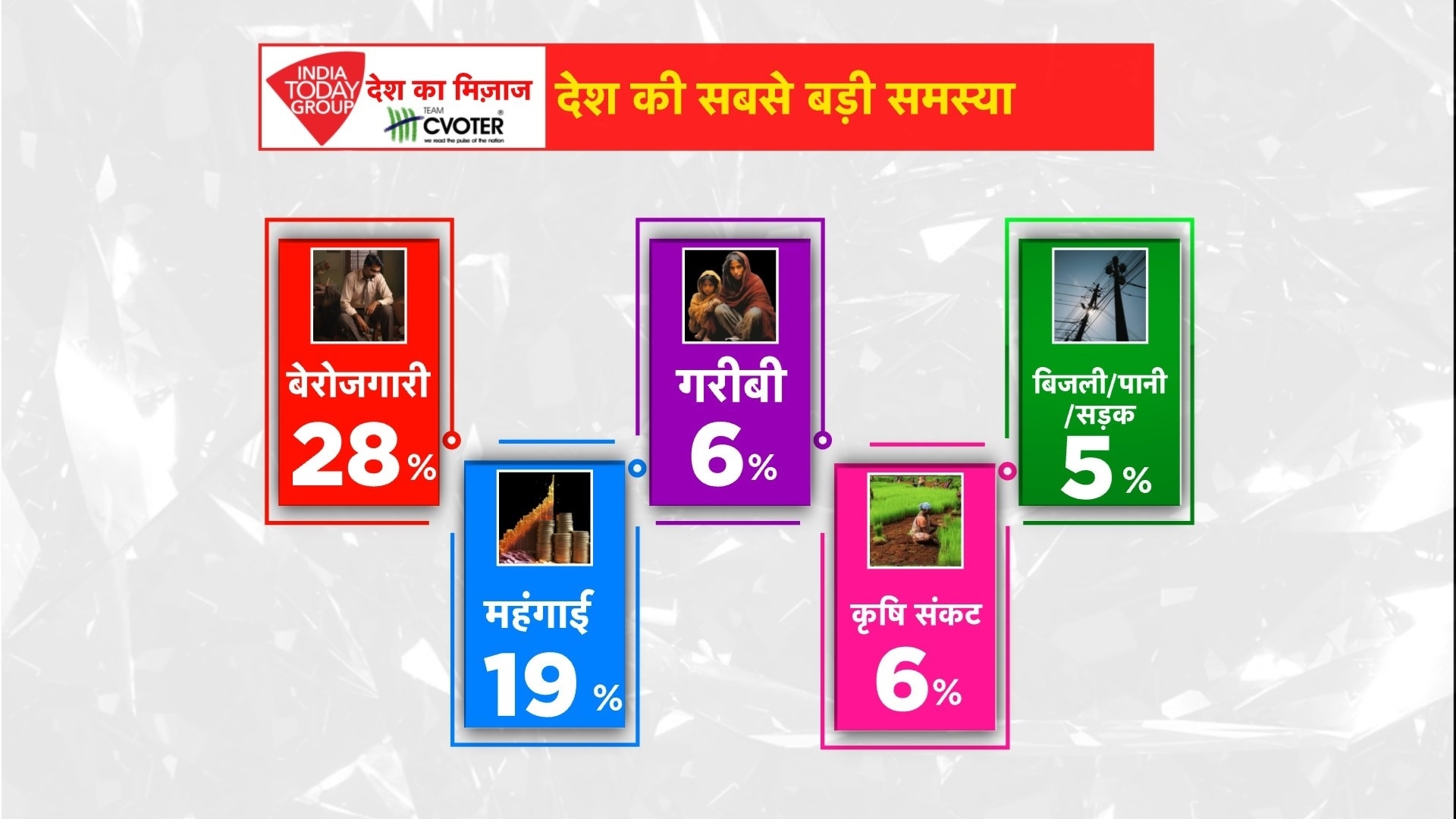 मूड ऑफ द नेशन सर्वे में 28 फीसदी लोगों ने बेरोजगारी को सबसे बड़ी समस्या बताया है. 19 फीसदी लोगों ने महंगाई, छह फीसदी लोगों ने गरीबी, छह फीसदी लोगों ने कृषि संकट और पांच फीसदी लोगों ने बिजली, पानी और सड़क को बड़ी समस्या बताया है. पिछले एमओटीएन में 26 फीसदी लोगों ने बेरोजगारी को बड़ी समस्या बताया था.
