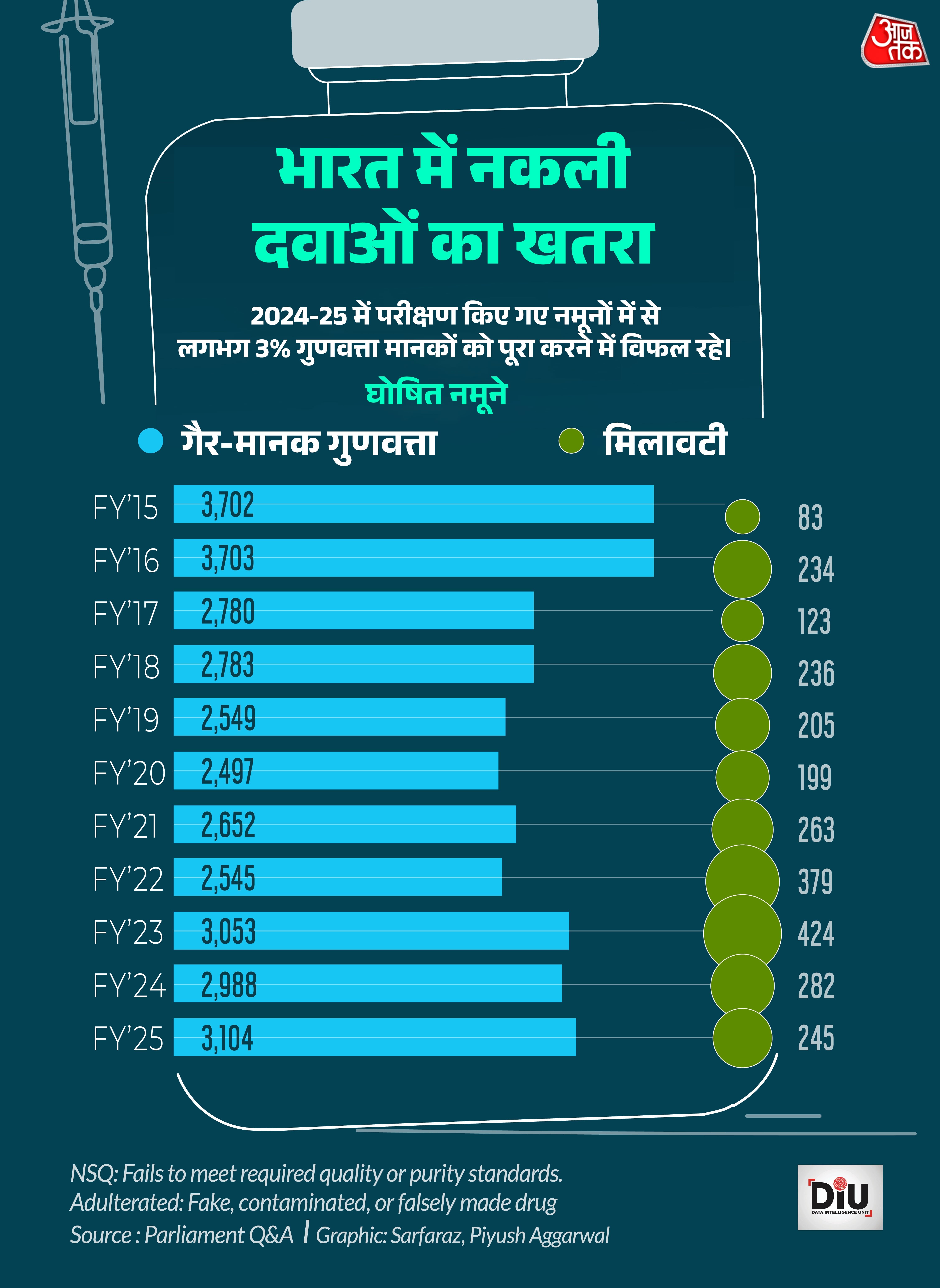 डेटा बताता है कि सैंपल टेस्टिंग बढ़ने के बावजूद सबस्टैंडर्ड और नकली दवाएं बाजार में लगातार आती हैं. अगस्त में 2024–25 के दौरान लगभग 1.2 लाख दवा सैंपल टेस्ट किए गए. साल 2014–15 में ये संख्या 74,199 थी यानी लगभग 57 प्रतिशत बढ़ोतरी. फिर भी 3,000 से अधिक दवाएं हर साल मूल गुणवत्ता परीक्षण में फेल होती हैं. सिर्फ 2024-25 में, 3104 सैंपल क्वालिटी ऑफ स्टैंडर्ड में फेल हो गए. इनमें से 245 को नकली या मिलावटी पाया गया. पिछले दशक में 32,000 से अधिक सैंपल टेस्ट फेल हुए और 2,500 से ज्यादा नकली या मिलावटी पाए गए. औसतन हर दिन आठ दवाएं गुणवत्ता परीक्षण में फेल होती हैं यानी लगभग हर तीन घंटे में एक.