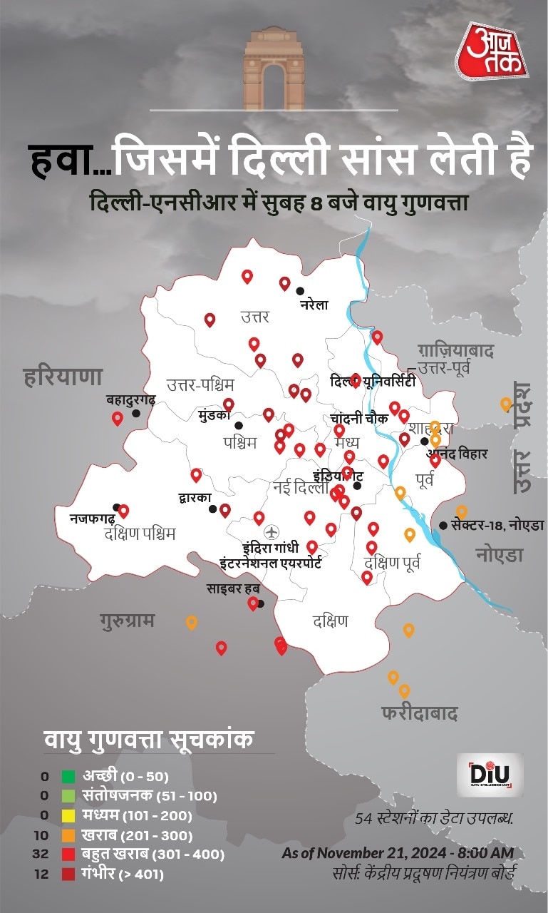 CPCB के आंकड़ों के अनुसार, आज (21 नवंबर) सुबह 7 बजे दिल्ली का औसत AQI 379 दर्ज किया गया है. इसके साथ ही कई जगहों का AQI अभी भी 400 के पार है.