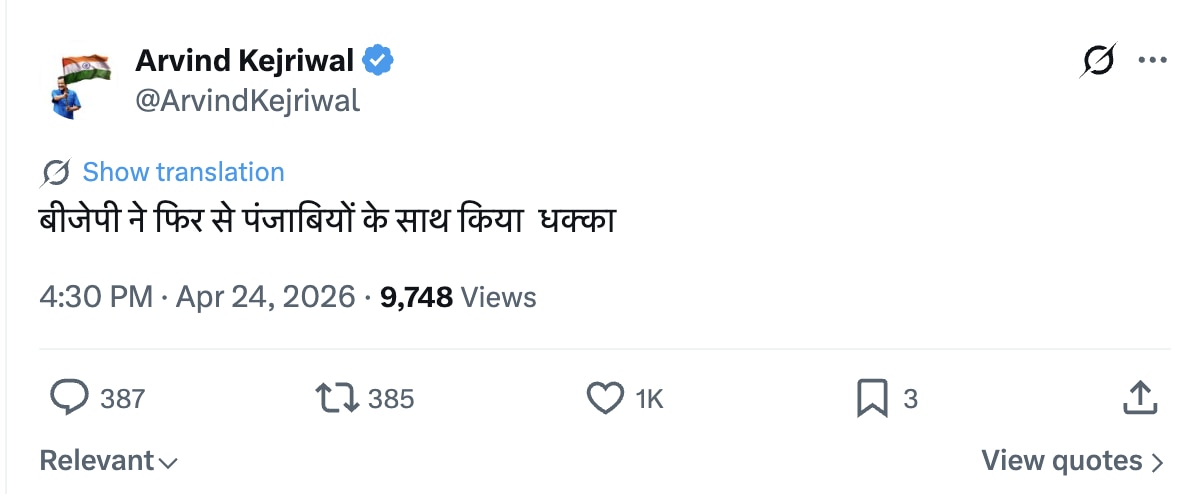सोशल मीडिया प्लेटफॉर्म एक्स पर पोस्ट करते हुए केजरीवाल ने ज्यादा कुछ नहीं लिखा. सिर्फ एक लाइन में अपनी बात कह दी. उन्होंने लिखा, 'बीजेपी ने फिर से पंजाबियों के साथ किया धक्का.'
