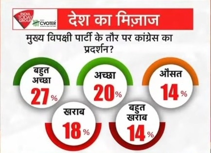 मूड ऑफ द नेशन सर्वे में मुख्य विपक्षी पार्टी के रूप में कांग्रेस के प्रदर्शन को लेकर भी सवाल पूछा गया. 27 फीसदी लोगों ने कांग्रेस के बतौर मुख्य विपक्षी पार्टी प्रदर्शन को बहुत अच्छा और 20 फीसदी लोगों ने अच्छा बताया है. 14 फीसदी लोगों ने मुख्य विपक्षी पार्टी के रूप में कांग्रेस के काम को औसत और इतने ही ने बहुत खराब बताया है. खराब कहने वालों की संख्या भी 18 फीसदी है. कांग्रेस को वास्तविक विपक्ष मानने वालों की संख्या भी 66 फीसदी है. कांग्रेस को वास्तविक विपक्ष नहीं मानने वाले लोगों की संख्या भी 27 फीसदी हैं.
