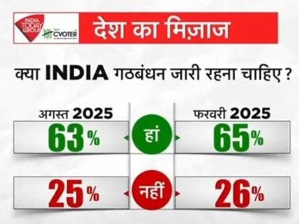 क्या विपक्षी गठबंधन इंडिया ब्लॉक जारी रहना चाहिए या नहीं, इसे लेकर भी सर्वे में सवाल पूछा गया. क्या इंडिया गठबंधन जारी रहना चाहिए? इस सवाल पर 63 फीसदी लोगों ने हां में जवाब दिया. नहीं कहने वालों की तादाद 25 फीसदी है. फरवरी, 2025 में हुए मूड ऑफ द नेशन सर्वे में 65 फीसदी लोगों ने हां और 26 फीसदी लोगों ने नहीं में जवाब दिया था.