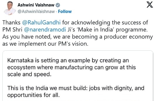 राहुल गांधी ने इसे रोजगार सृजन की दिशा में परिवर्तनकारी कदम बताते हुए कांग्रेस की सरकार वाले कर्नाटक के अनुकूल माहौल की तारीफ की. केंद्र सरकार में आईटी मंत्री अश्विनी वैष्णव ने इसी पोस्ट के लिए राहुल गांधी को थैंक यू कहा है. अश्विनी वैष्णव ने तंज करते हुए यह भी कहा कि राहुल गांधी ने पीएम मोदी के मेक इन इंडिया प्रोग्राम की सफलता स्वीकार की है. इसके लिए उन्हें (राहुल गांधी को) धन्यवाद. उन्होंने अपनी एक्स पोस्ट में आगे लिखा है कि हम प्रधानमंत्री के विजन को लागू करते हुए एक प्रोडक्टिव इकोनॉमी बनते जा रहे हैं.