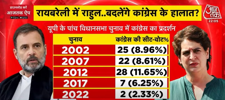 यूपी में पांच विधानसभा चुनाव में प्रदर्शन को देखें तो 2002 कांग्रेस की 25 सीट (8.96 वोट प्रतिशत), 2007 में 22 सीट (8.61 वोट प्रतिशत), 2012 28 सीट (11.65 वोट प्रतिशत), 2017 में 7 सीट (6.25 प्रतिशत), 2022 में 2 सीटें (2.33 वोट प्रतिशत). यानी कांग्रेस देश के सबसे बड़े चुनावी राज्य में दो विधआनसभा सीट तक सिमट चुकी है. वहां दस साल बाद लोकसभा चुनाव में दस फीसदी के करीब कांग्रेस का वोट शेयर पहुंचा है और सीट छह हुई हैं. ऐसे में रायबरेली की सीट के साथ अमेठी जीत चुकी कांग्रेस को लगता है कि अखिलेश यादव के साथ गठजोड़ का मिला फायदा और भी मजबूत करके उस जमीन को हासिल किया जा सकता है, जिसे धीरे धीरे पार्टी खोती चली गई.