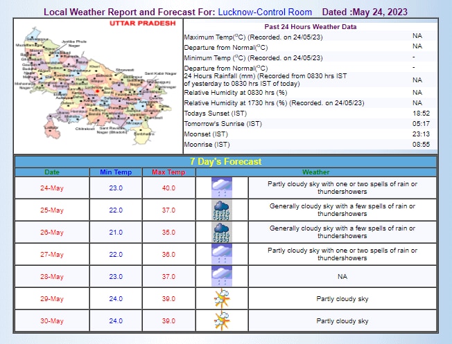 उत्तर प्रदेश के कई इलाकों में मगंलवार रात से ही रुक-रुककर ठंडी हवाएं और बूंदाबांदी हो रही है. इससे लोगों को भीषण गर्मी से राहत मिली है. मौसम के पूर्वानुमान के मुताबिक, यूपी की राजधानी लखनऊ में आज आंशिक रूप से बादल छाए रहने के साथ एक या दो बार बारिश या गरज के साथ बौछारें पड़ सकती है. वहीं, 25 और 26 मई को आमतौर पर आसमान में बादल छाए रहेंगे और कुछ स्थानों पर बारिश या गरज के साथ छींटे पड़ सकते हैं. 27 मई से बारिश की गतिविधियां कम होंगी लेकिन ये 28 मई तक जारी रहेंगी. इससे माना जा सकता है कि 28 मई तक यूपी में गर्मी से राहत मिलेगी.