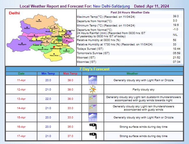 दिल्ली में आज भी अधिकतम तापमान 39 डिग्री रह सकता है और न्यूनतम तापमान भी 21 डिग्री सेल्सियस रहेगा. हालांकि आज आसमान में बादल छाए रह सकते हैं लेकिन गर्मी से राहत की कोई खास उम्मीद नहीं है. लेकिन कल (13 अप्रैल) से दिल्ली का मौसम बदलेगा. 13 अप्रैल की रात में तेज हवाओं के साथ हल्की बारिश, धूल भरी आंधी और गरज के साथ छींटे पड़ेंगे. इससे गर्मी में काफी राहत देखने को मिलेगी. ये सिलसिला दो से तीन दिन रह सकता है.
